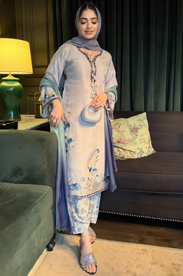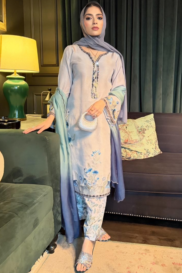 An embroidered Korean silk shirt paired with a printed shalwar. It is complemented by a pure organza ombré-dyed, scalloped-edge dupatta. Finished with delicate handmade tassels at the neckline for that perfect artisanal touch.