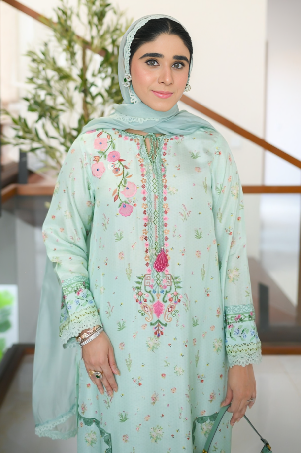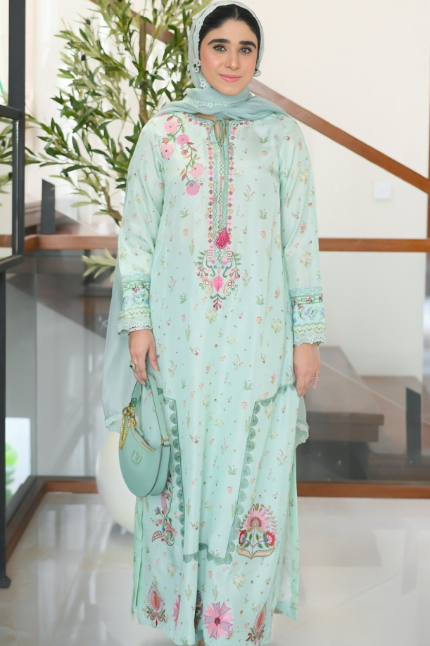 It is a Korean raw silk outfit. It is a dyed and delicately embroidered ensemble paired with a sleek skinny shalwar with a digitally printed dupatta, finished with soft scalloped edges.